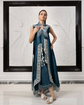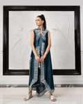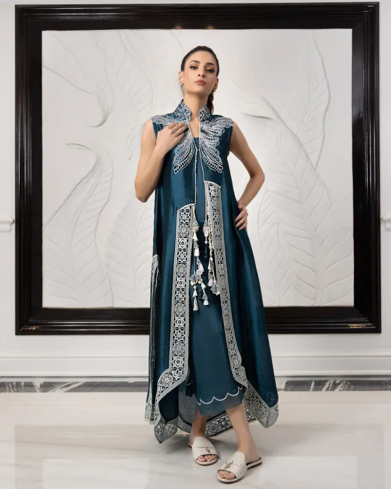 Asymmetric jacket with cutwork embroidered borders defining the lengths. Drape this beautiful jacket done in pure self patterned silk to exude grace and style. The jacket comes with a short (knee length) slip.