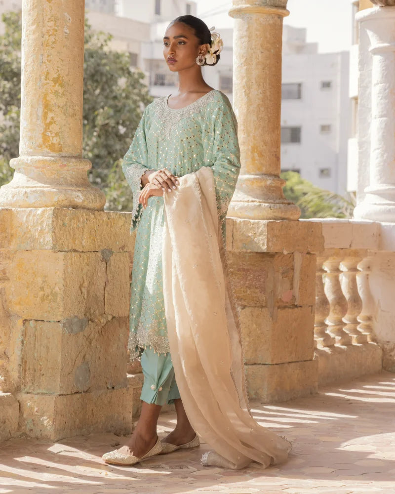 A statement outfit in silk khadi net, where masterful handwork with zardosi and kamdani creates an aura of timeless beauty and craftsmanship.