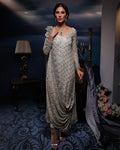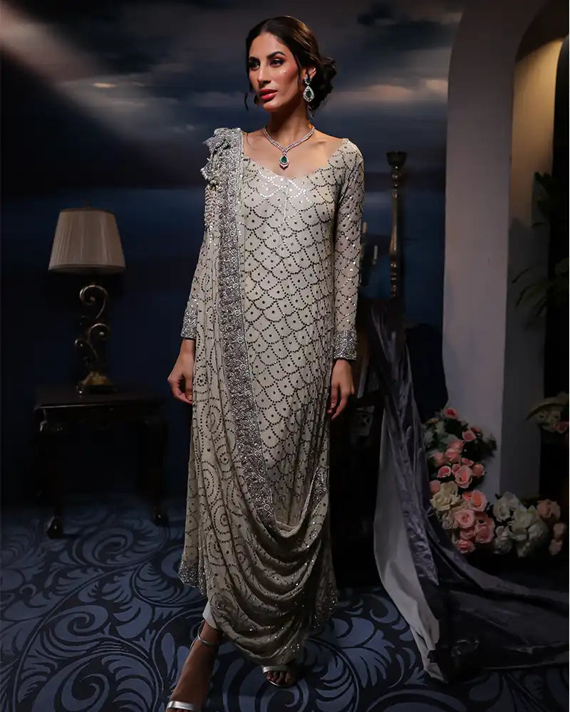 Flowy pure crepe georgette shirt with and attached draped duppata speaks for itself.. The dense mukesh work all over glems addiding to the intricate zardoze borders and hemline.