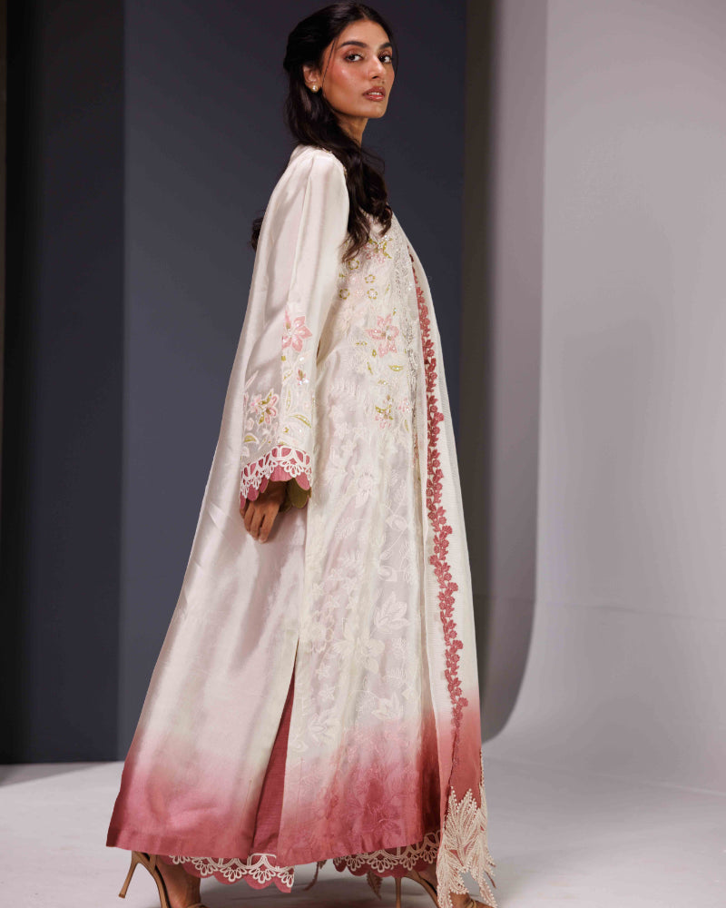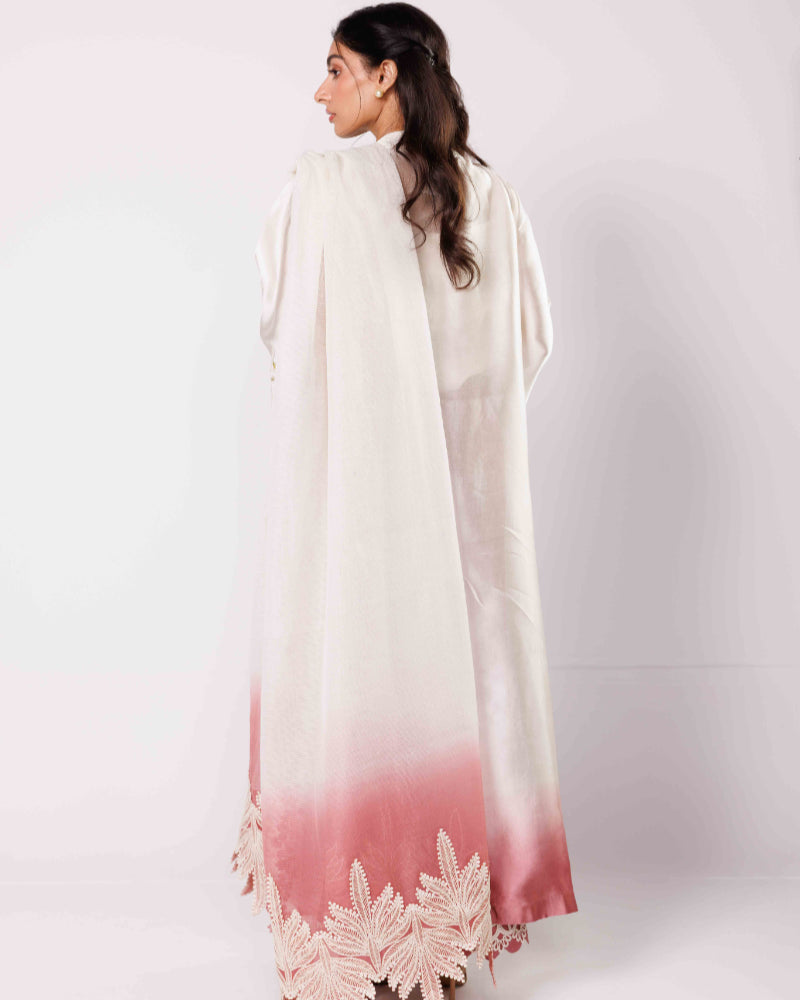 Step into timeless elegance with Nisa Pink, a refined ensemble that blends classic charm with modern sophistication. Crafted from premium embroidered fabric, the shirt features a beautifully detailed front adorned with intricate embroidery. Delicately scalloped hand embroidery and lacework grace the sleeves, adding an artisanal touch.