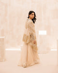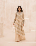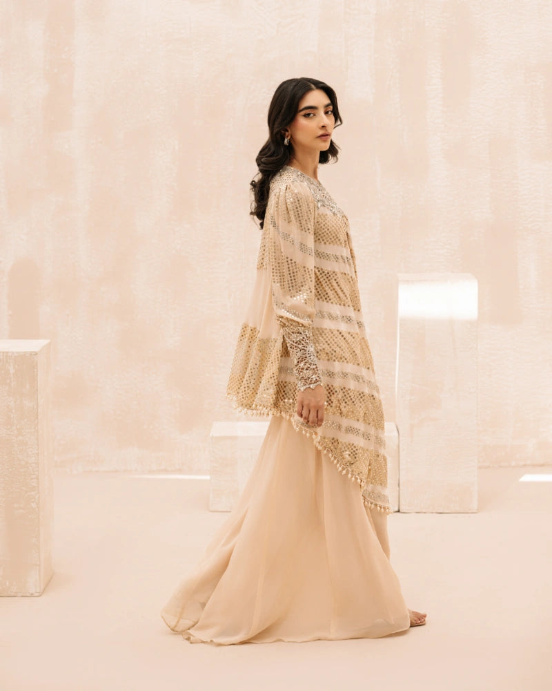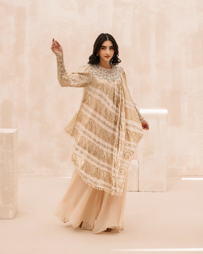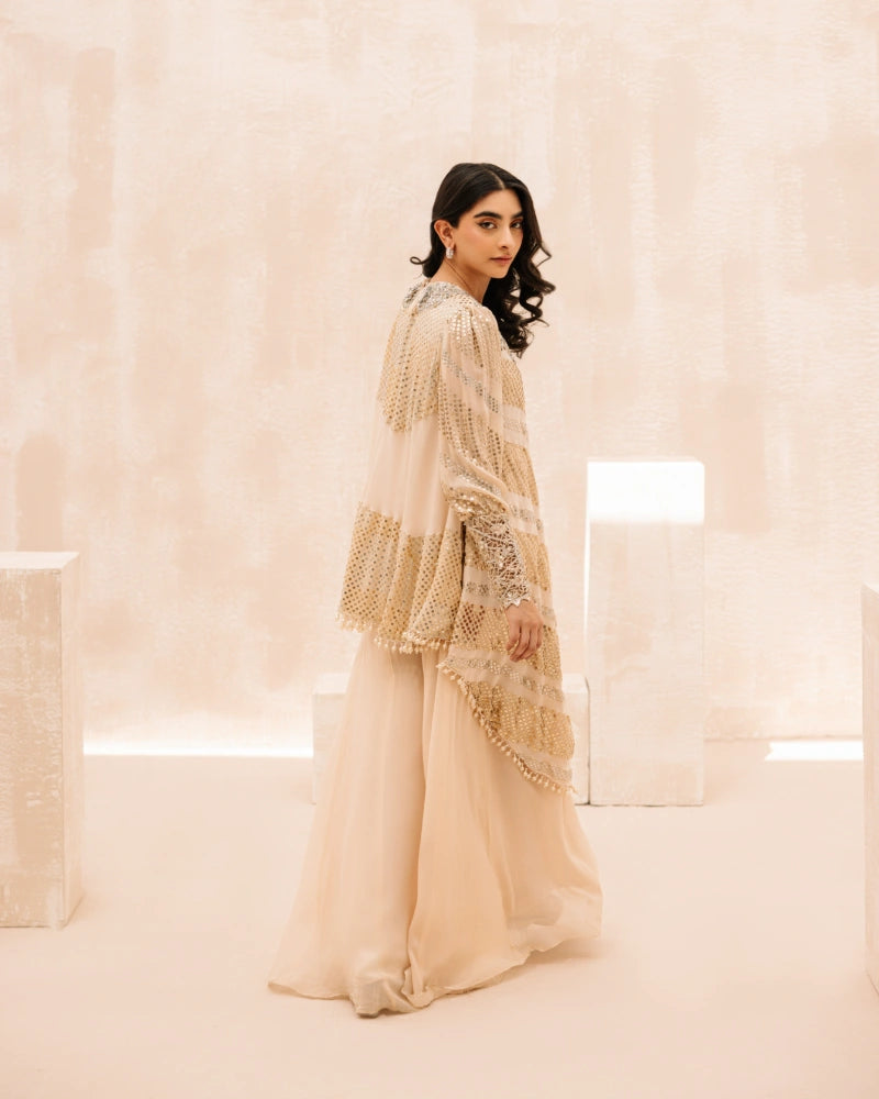 Detailing: A dreamy blend of tradition and elegance, this ensemble features a flowy chiffon kaamdani mukesh shirt with a hand-embellished neckline and delicately worked cuffs. The asymmetric silhouette adds a graceful flair, perfectly paired with wide-legged chiffon palazzo pants for a light, ethereal finish.