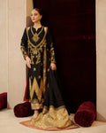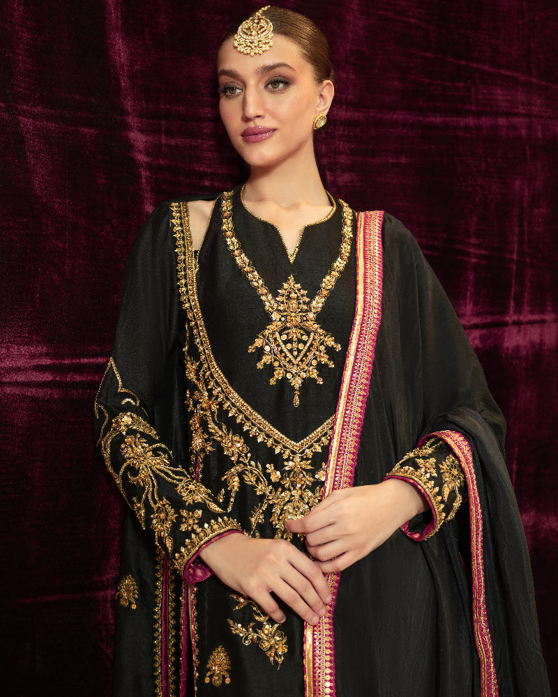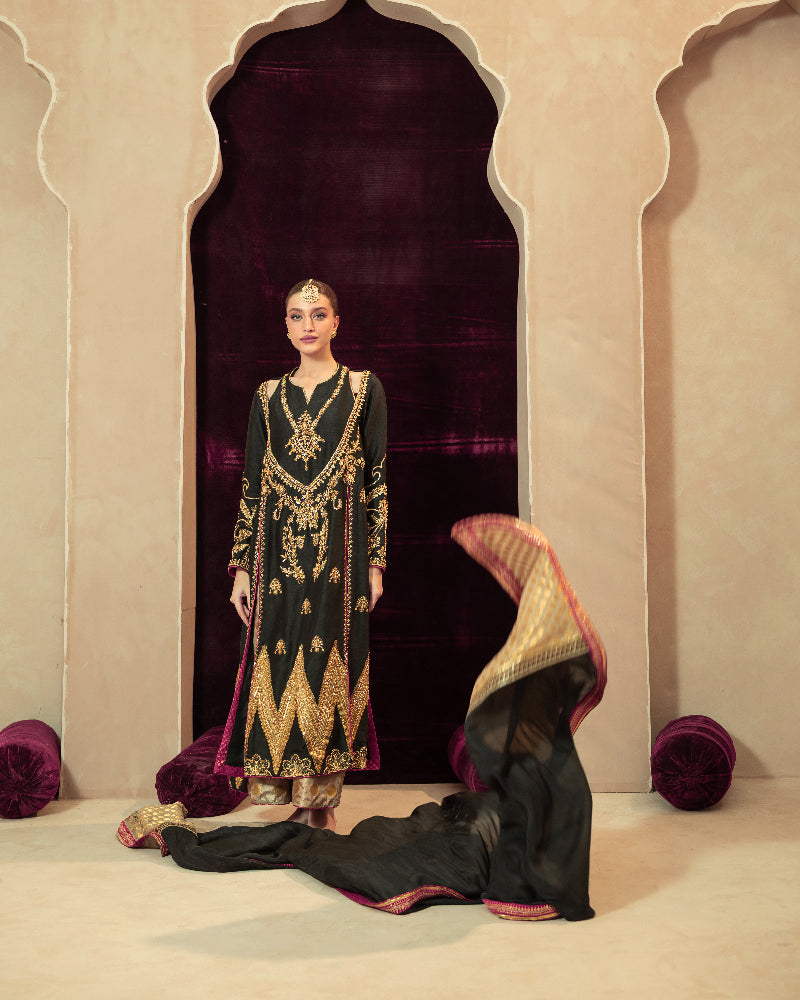 Paneled straight-cut shirt with full-fit sleeves, styled with banarsi culotte pants and a matching dupatta for an elevated formal look. A bold blend of black and rich gold with subtle hints of deep red. The shirt is adorned with tilla embroidery and intricate hand zardoze work, finished with refined cutwork details. Accented with gold gota, paired with culottes crafted in polka-dotted woven banarsi silk. The dupatta features striking polka dot banarsi pallu’s and is framed with a four-side deep red marrori border for a statement finish.