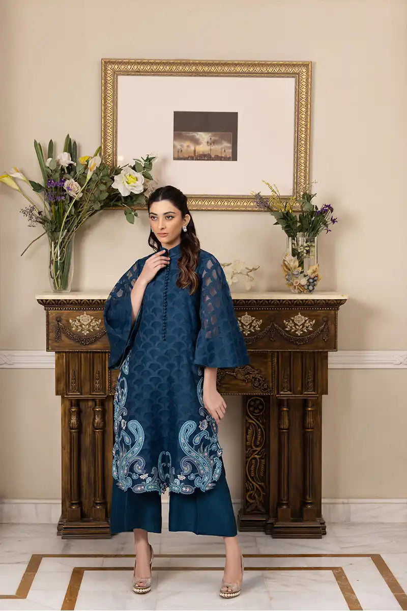 Artful simplicity and timeless appeal, Paisley showcases a blend of embroidery on an organza base and pure silk inner, paired with cotton culottes. Be sure to stand bold and turn heads at any event whether it is a red carpet evening soiree or daytime brunch