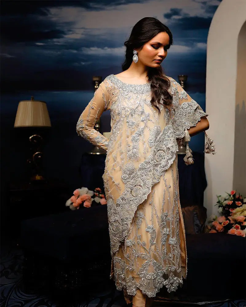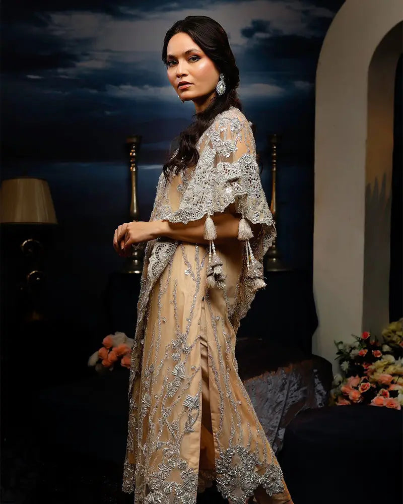 Peach net Assymetric shirt. Heavliy worked with crystal swarovskis and cutwork.