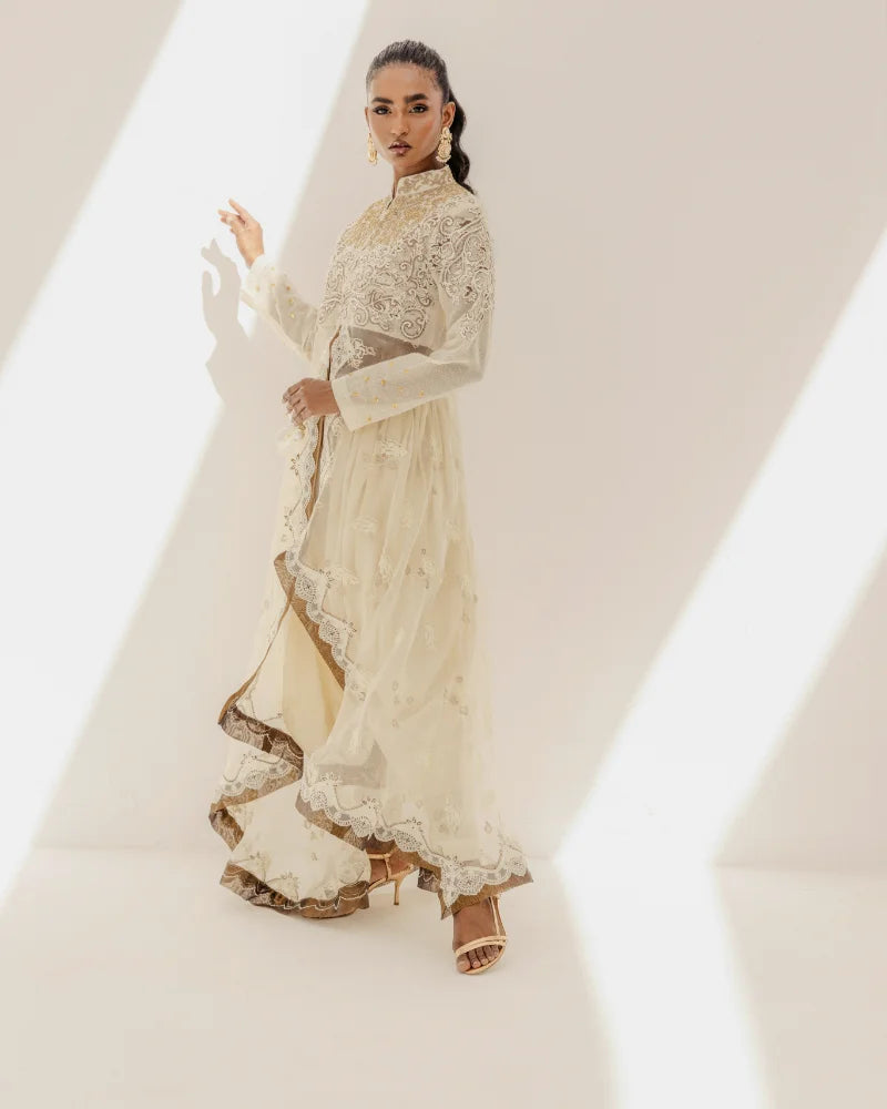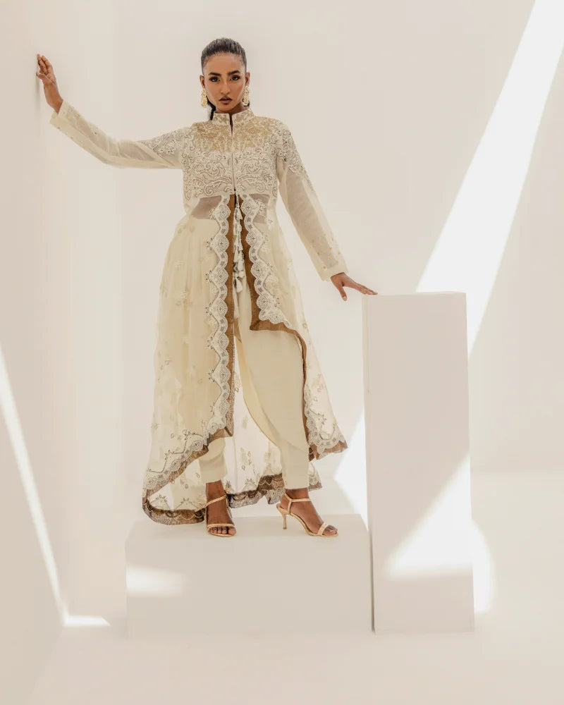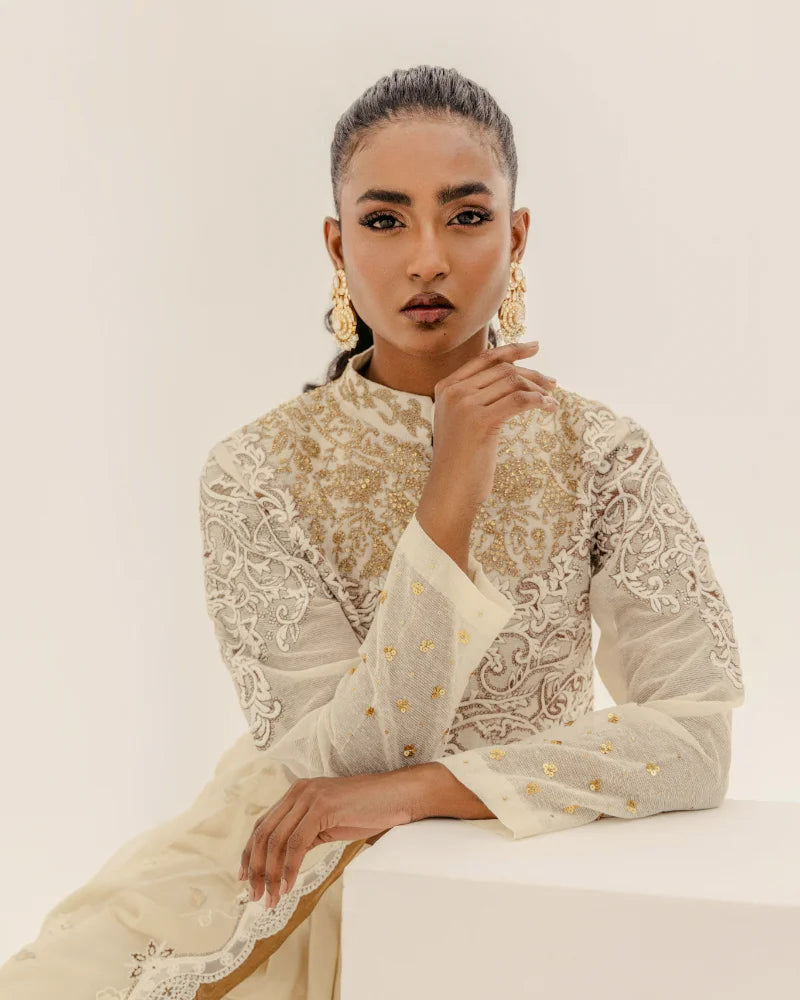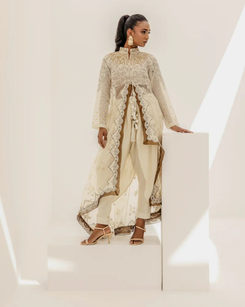 Detailing: Marorri embroidery on bodice & sleeves complimenting the embroidered borders running along the front slit & all-round hemline