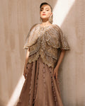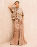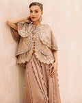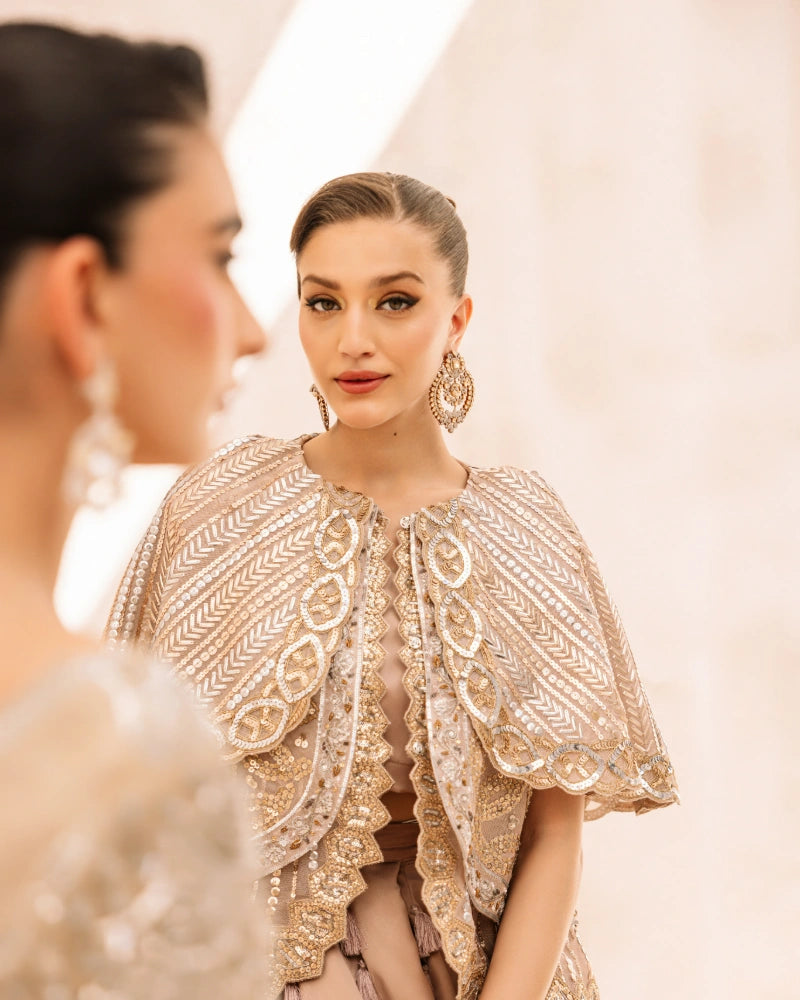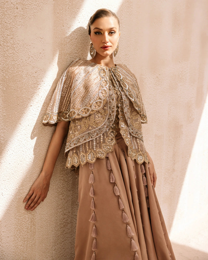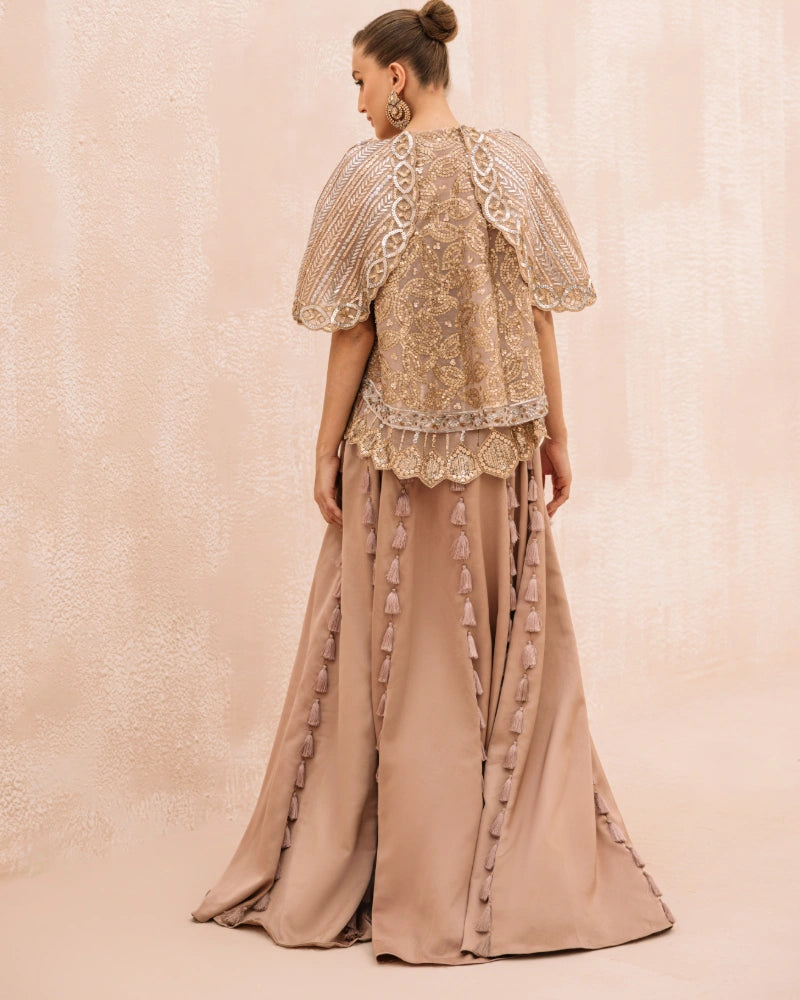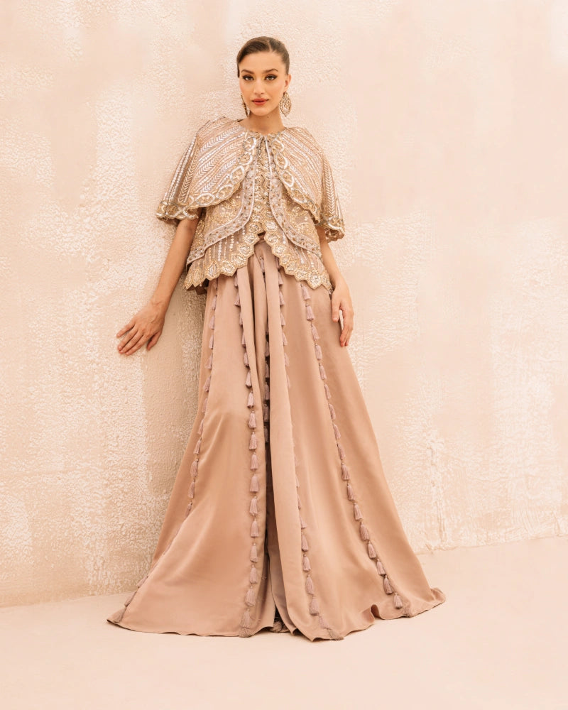 Detailing: Drenched in rose gold glamour, the Rayna Cape is a statement ensemble featuring exquisite all-over handwork with metallic sequins that catch the light from every angle. The sculpted cape, paired with flowy, tassel-detailed pants, creates a bold yet graceful silhouette, perfect for making an entrance.