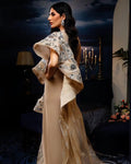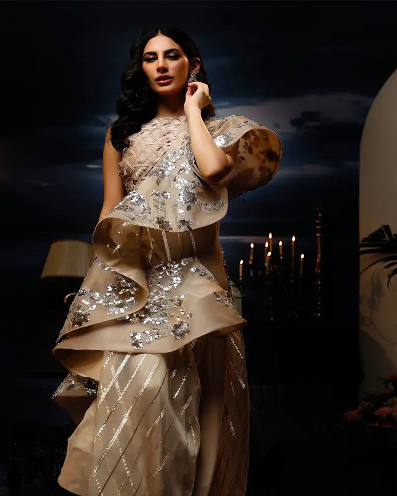 Dainty dramatic & delusional organza ruffled tucked in a modern draped saree. Front panel worked with a glamorous gold silver sequence pattern. Paired with a silk ribbon textured blouse .