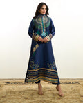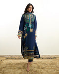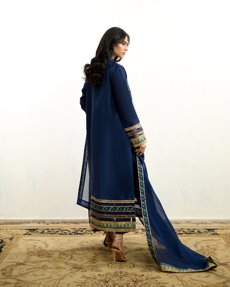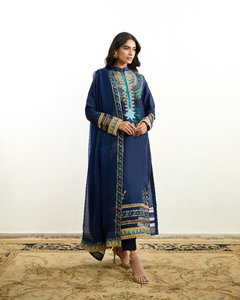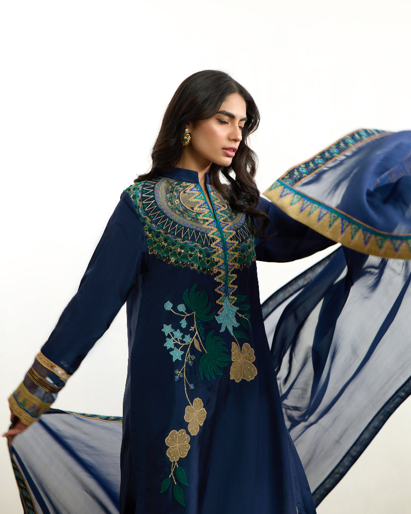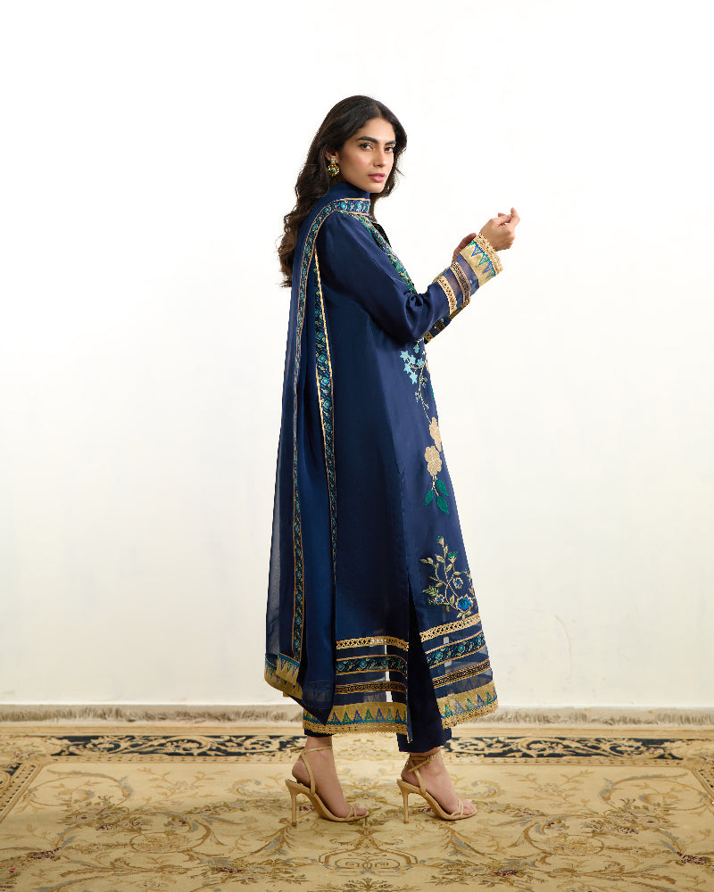 A straight long shirt crafted in butter silk, featuring full-length sleek sleeves, paired with silk pants and a soft silk organza dupatta. Set in deep navy, this ensemble is adorned with rich gold and multicolour embroidery across the shirt, complemented by intricately detailed block-printed borders. The blend of textures and embellishments creates a look of timeless elegance and refined sophistication.