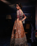 Magenta silk choli with all over gota work. Rose gold lame' lehanga with a heavy gauga jamni border and all over motifs. Magenta organza duppata all over embelished and enhanced with handwork bunches on pallu, duppata length 3.25 yards.