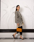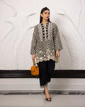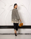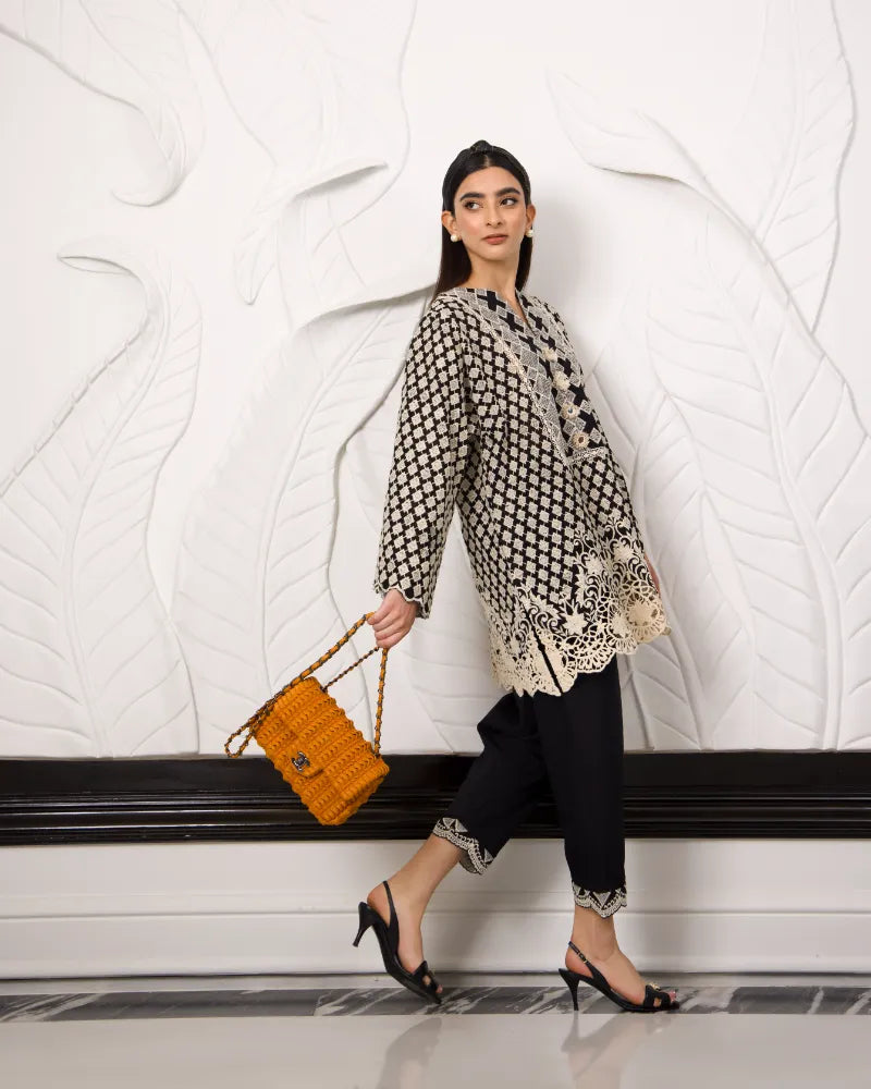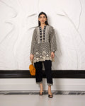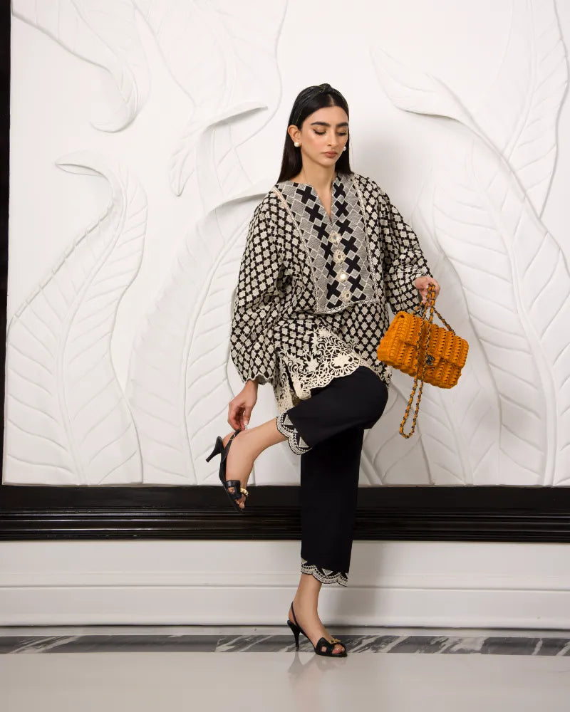 The allure of mono chrome with exquisite embroidery neck detailing. This enchanting ensemble, crafted from fine cotton t fabric, evoking the essence of the season while showcasing meticulous artistry and effortless style.