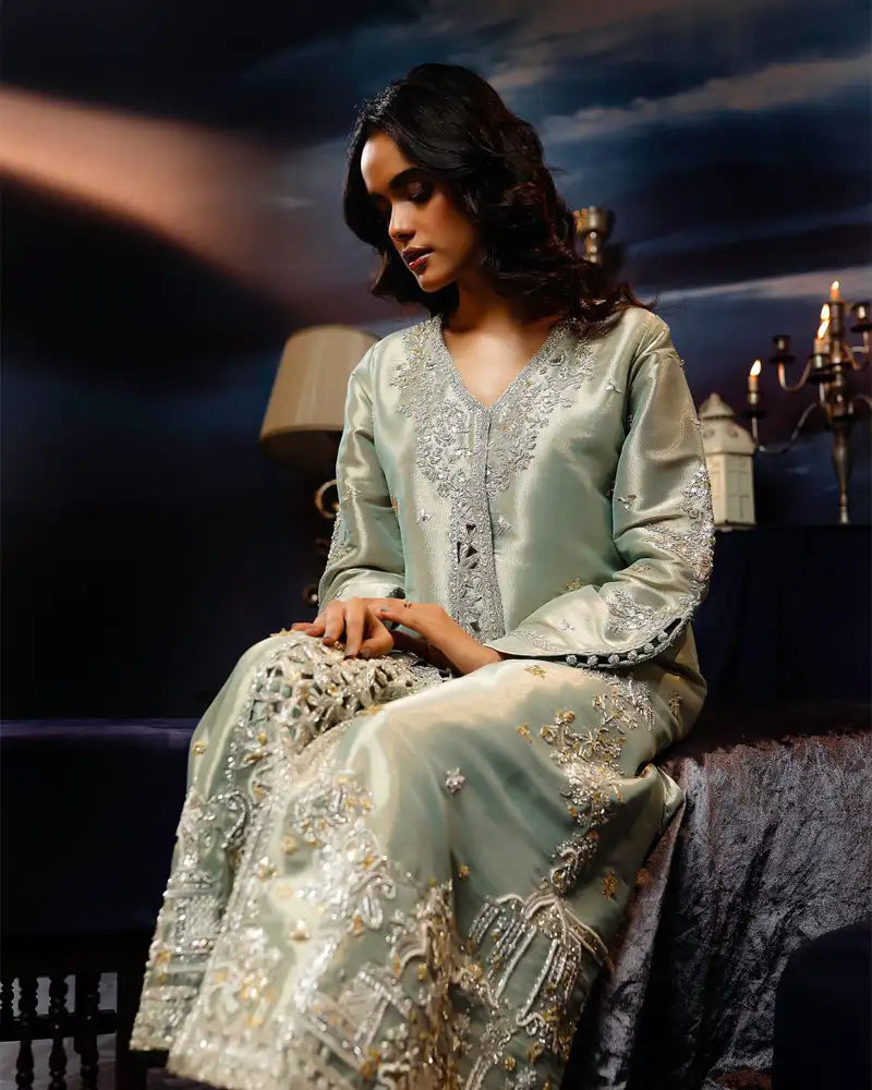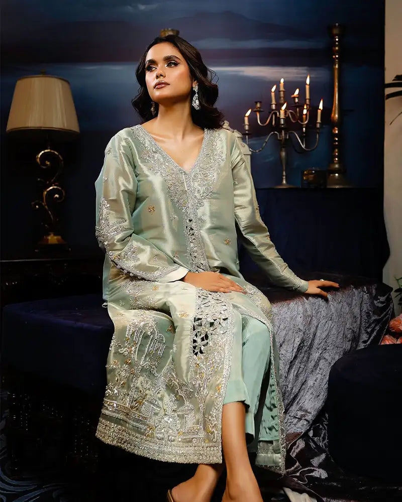 A line front open shirt with traditional gota and intricate handcrafted cutwork paired with a silk straight pant.