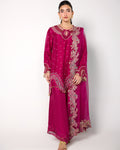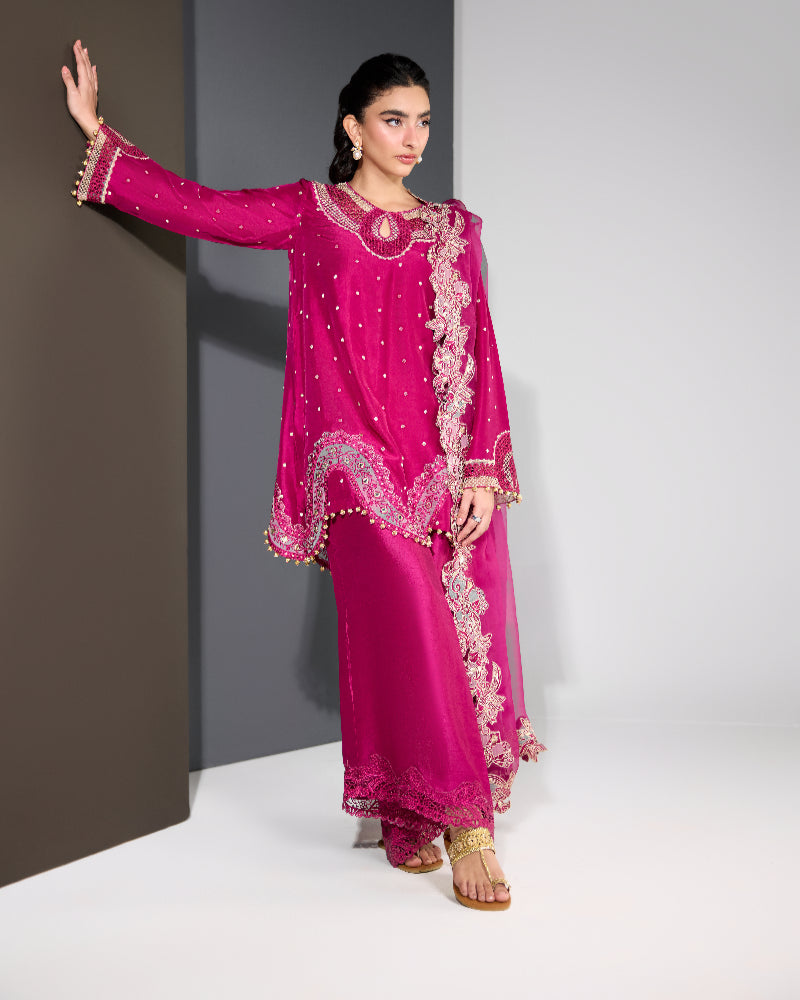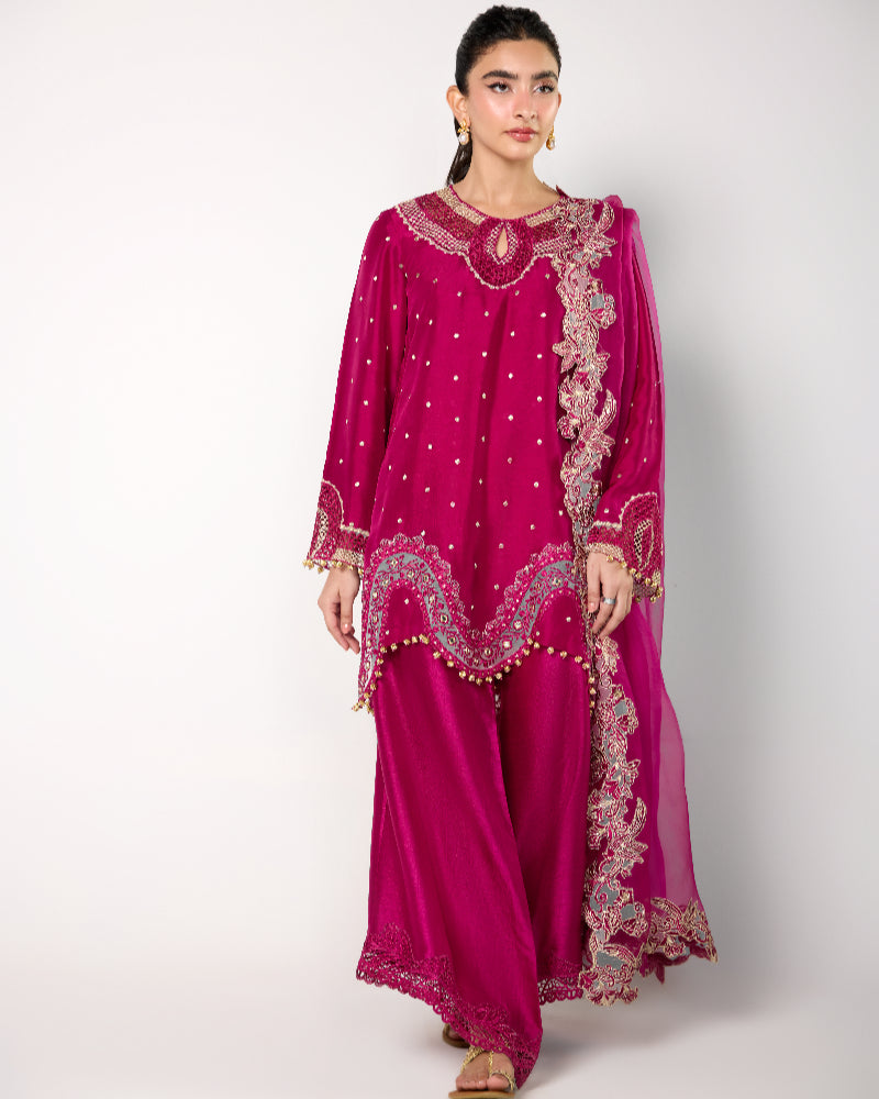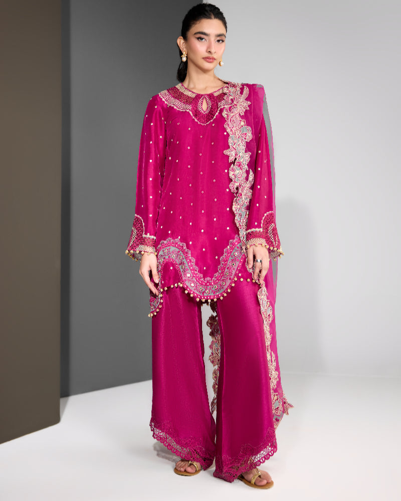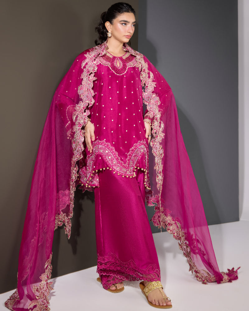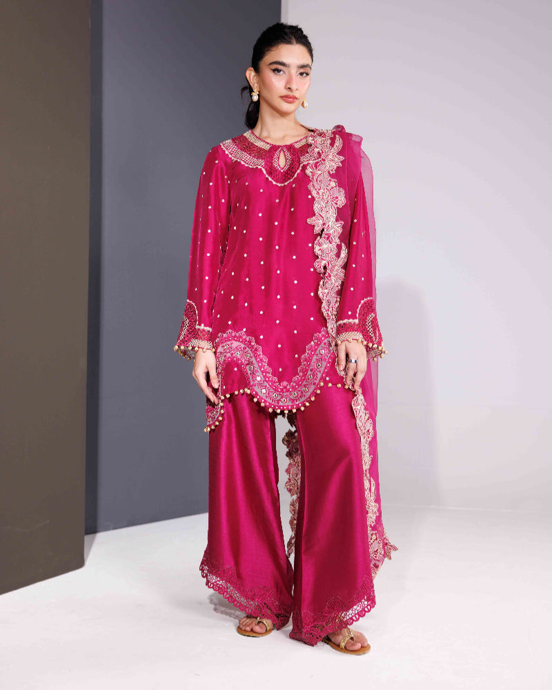 Make a timeless statement in this luxurious 3-piece magenta ensemble, blending traditional elegance with modern craftsmanship. Crafted from premium silk, the knee-length shirt is adorned with intricate machine embroidery, hand-finished embellishments, and delicate pearls. The cutwork hem and sleeves, paired with a chic keyhole neckline, bring a sophisticated touch to the design.