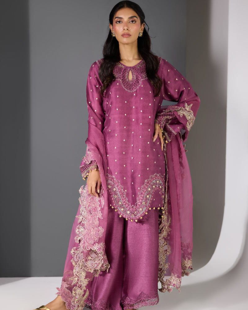 The outfit features matching silk palazzo pants in an asymmetric cut, with embroidered hems perfectly coordinated with the shirt’s design. A soft organza dupatta, finished with a scalloped cutwork embroidered border, completes the look — making it ideal for festive and formal occasions.