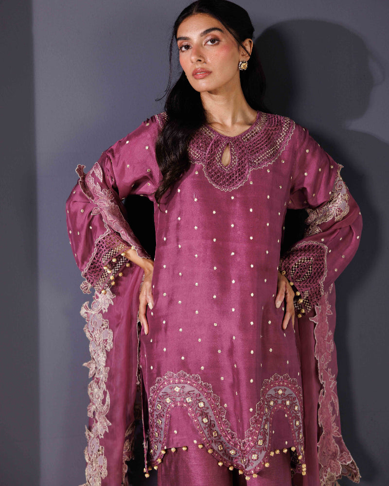 Make a timeless statement in this luxurious 3-piece emythist ensemble, blending traditional elegance with modern craftsmanship. Crafted from premium silk, the knee-length shirt is adorned with intricate machine embroidery, hand-finished embellishments, and delicate pearls. The cutwork hem and sleeves, paired with a chic keyhole neckline, bring a sophisticated touch to the design.