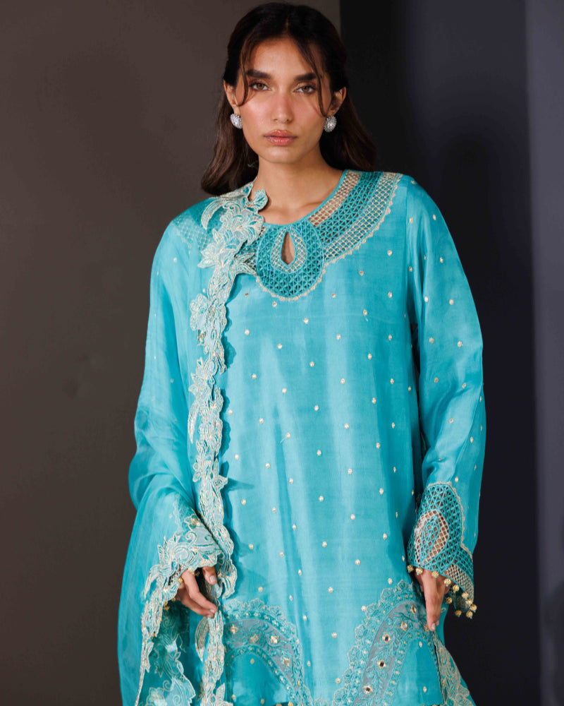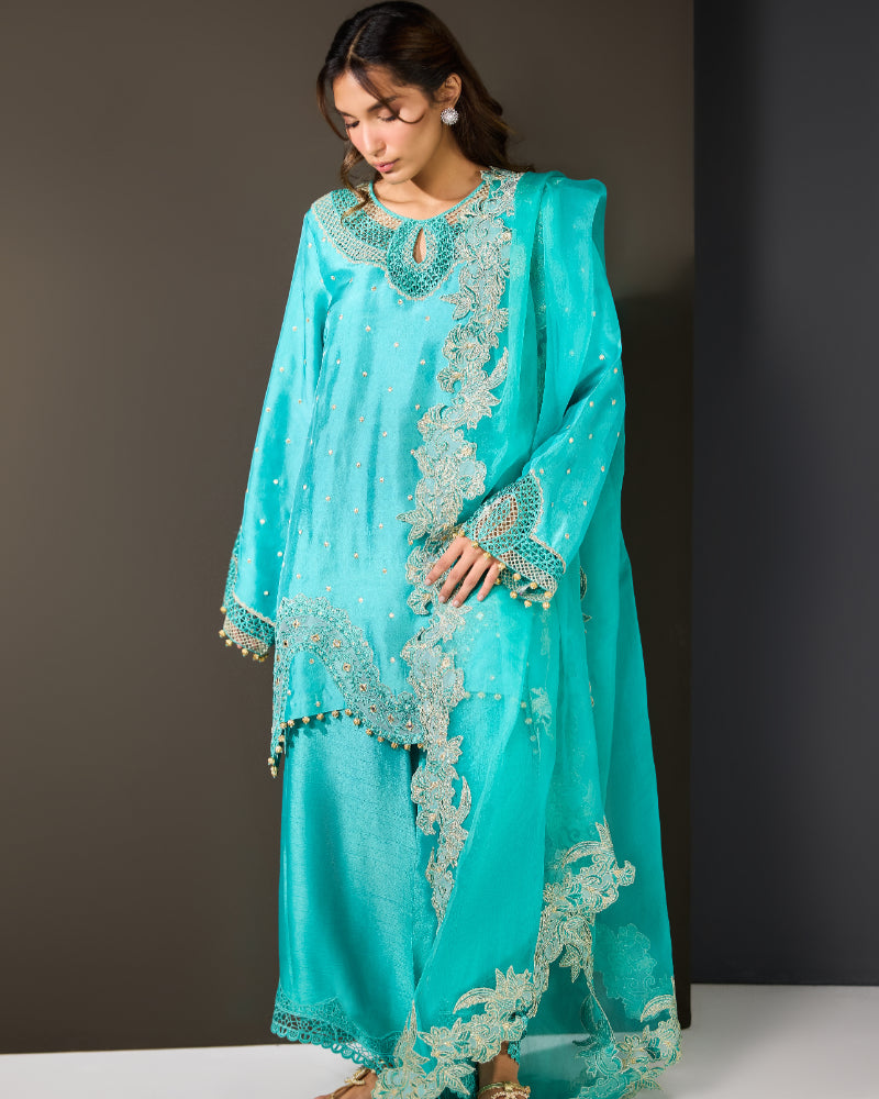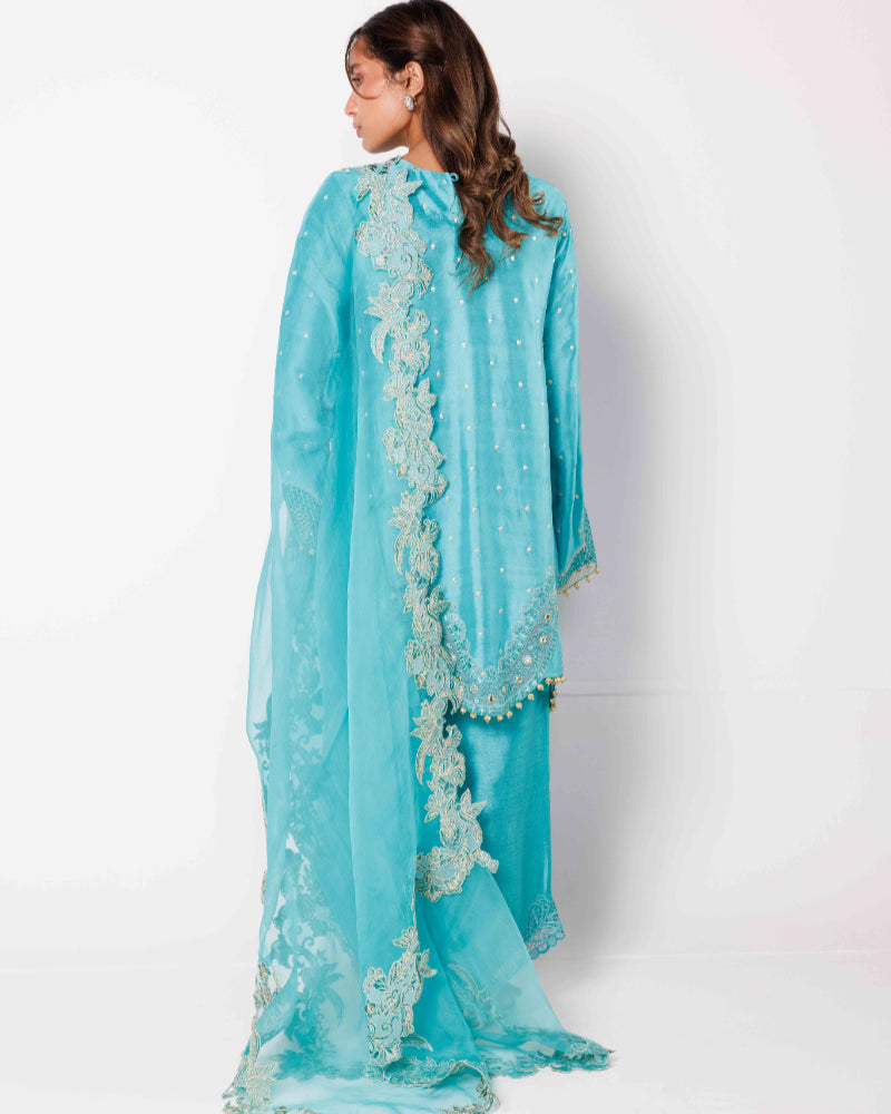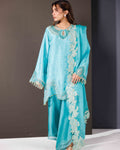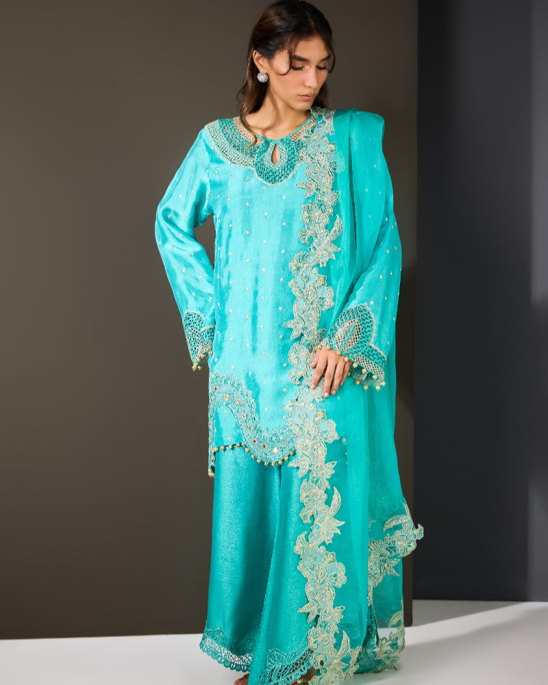 The outfit features matching silk palazzo pants in an asymmetric cut, with embroidered hems perfectly coordinated with the shirt’s design. A soft organza dupatta, finished with a scalloped cutwork embroidered border, completes the look — making it ideal for festive and formal occasions.