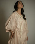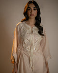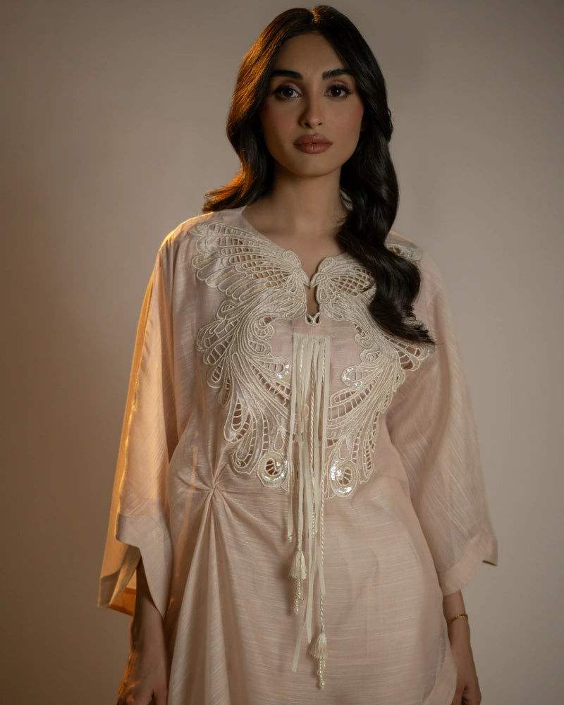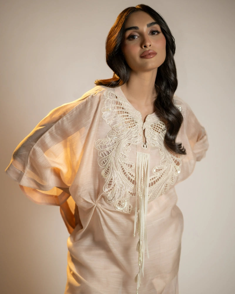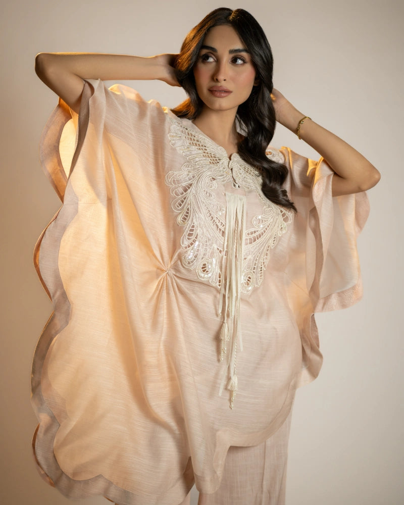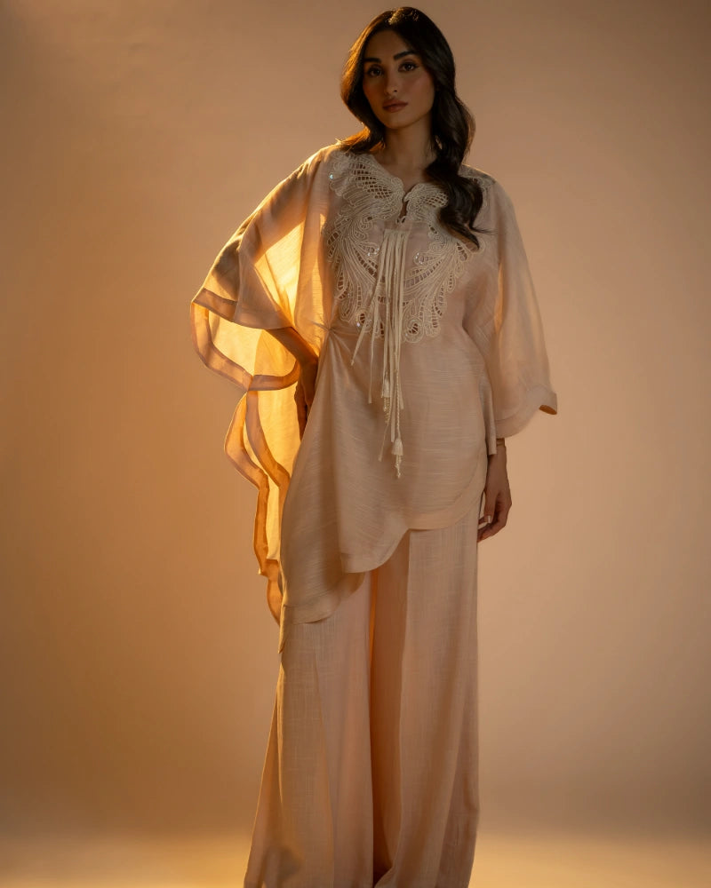A petal peach poncho top with a fluid, layered silhouette, featuring intricate cutwork embroidery and pearl-tassel detailing. Light, graceful, and perfect for easy elegance.