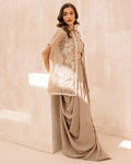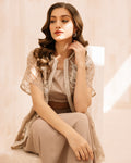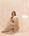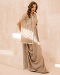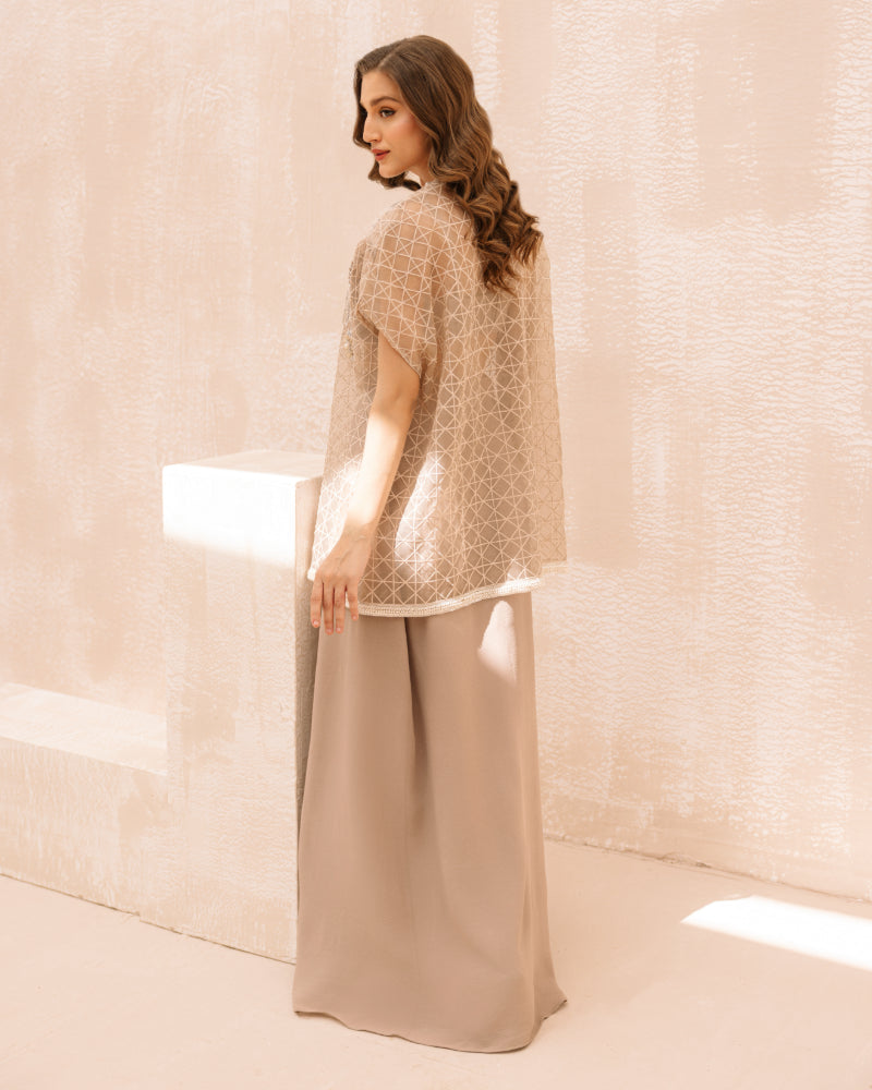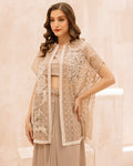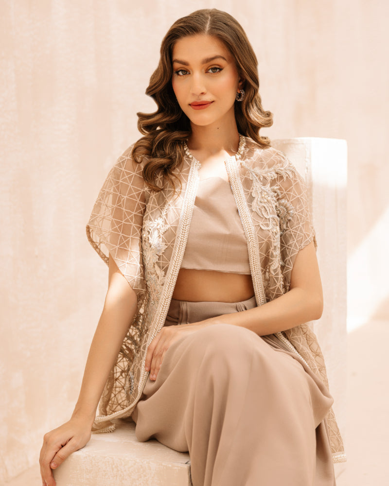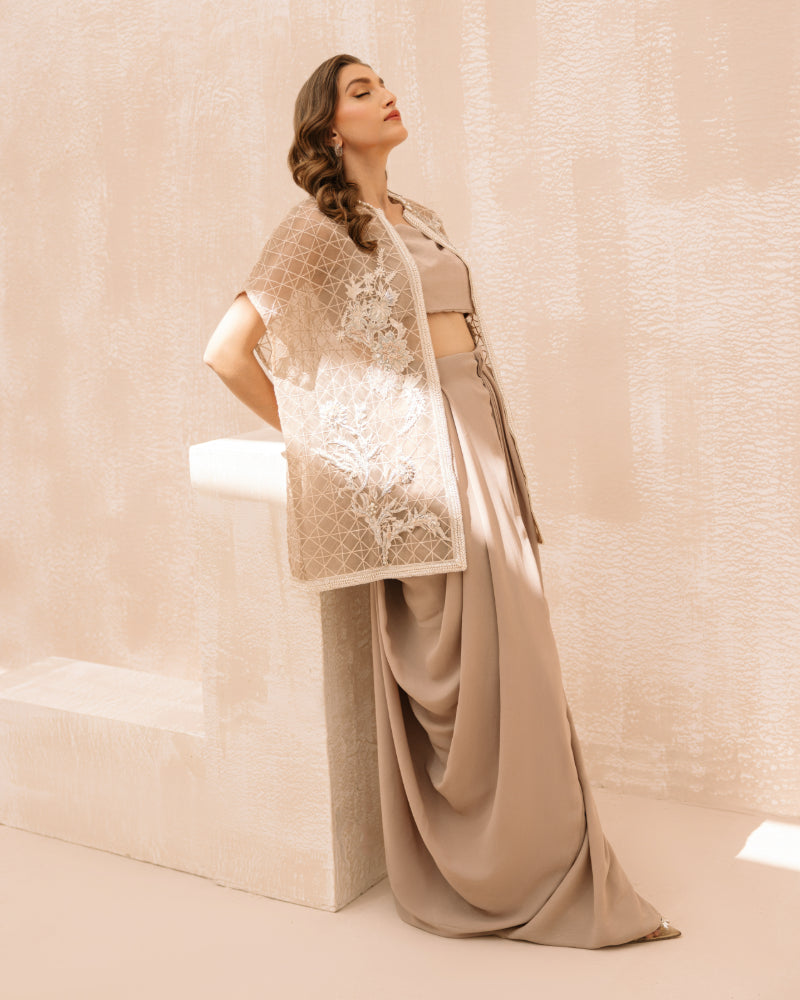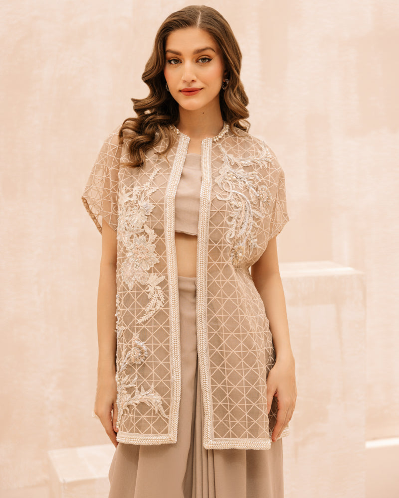Detailing: Cutwork embroidery cape jacket adorned with pearl trimmings and intricate handworked floral motifs, elevated by a blend of exquisite handwork stitches for a timeless, elegant charm.