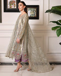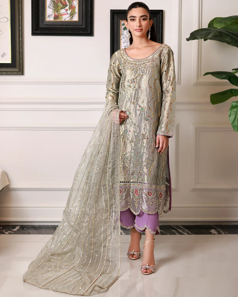 An attire crafted from pure lamé silk, with intricate handwork featuring zardosi and kamdani work.
