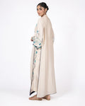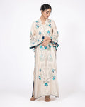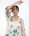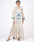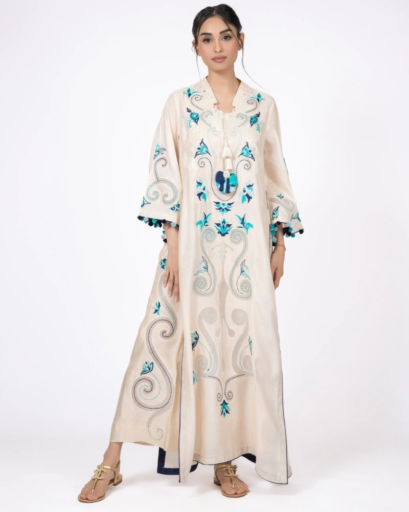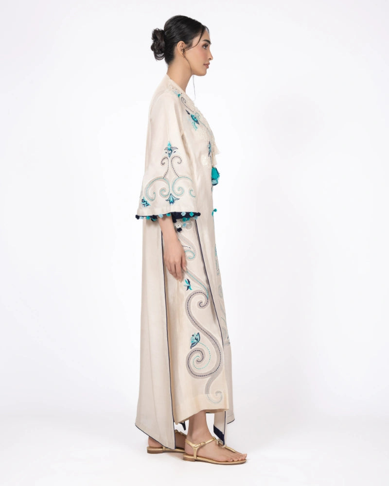 This Ivory outfit features intricate thread embroidery in shades of turquoise, teal, and navy, with delicate lace inserts and playful tassels. Pom-pom detailing on the sleeves adds a fun touch to the elegant look.