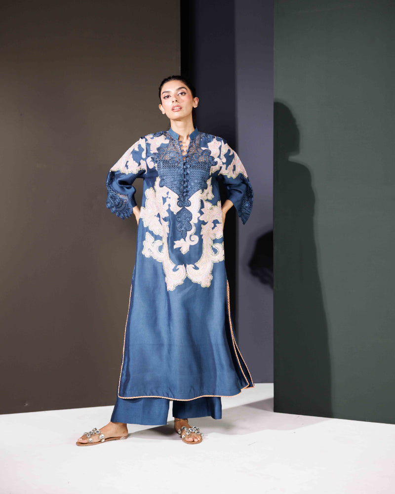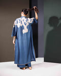 Embrace timeless elegance with Teal Paisley, an exquisite ensemble crafted from luxurious cotton seesha fabric. The shirt features intricate paisley embroidery around the neckline, blending traditional charm with contemporary sophistication.
