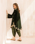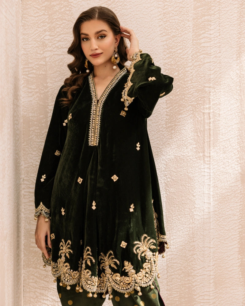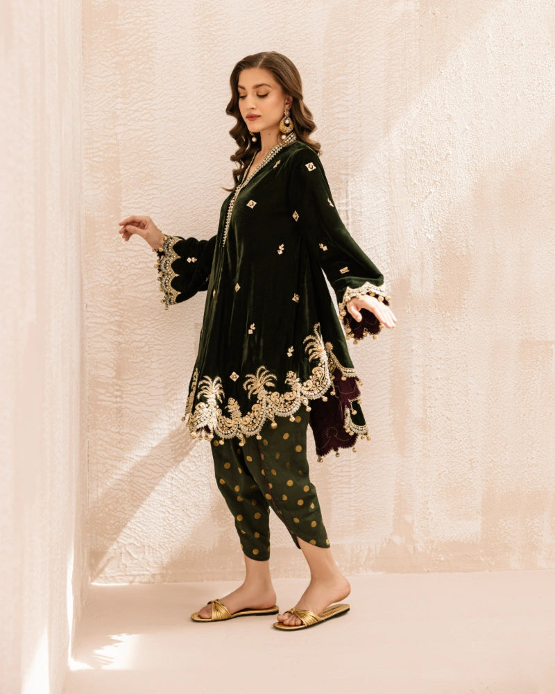 Detailing: Grace drapes effortlessly in Zareen—a moss green velvet ensemble adorned with intricate zardozi handwork. The silhouette features a regal scalloped hemline that flows with charm, while gold polka-dotted pants add a playful contrast. A celebration of elegance and craftsmanship, perfect for festive evenings.