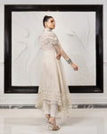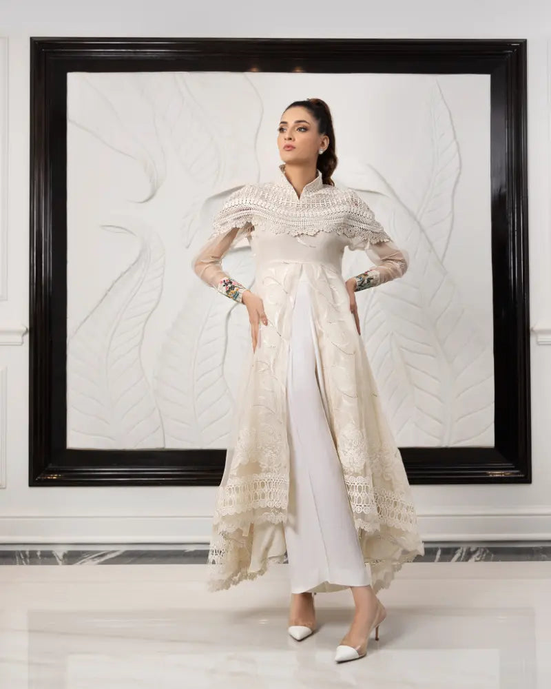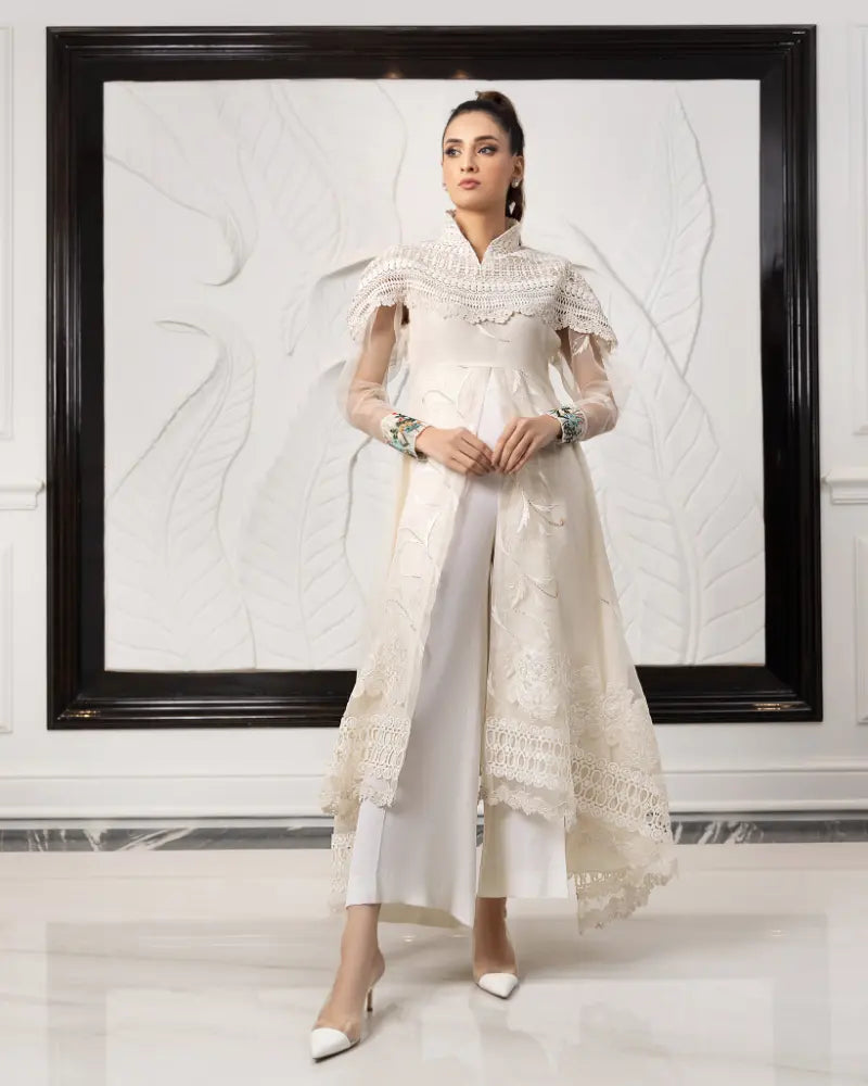 A flowy self embroidered pure organza asymmetric hemline shirt. Adorned with a laced bodice design , silk therad multi embroidered cuffs and an embroidered hemline. silk lining attached.
