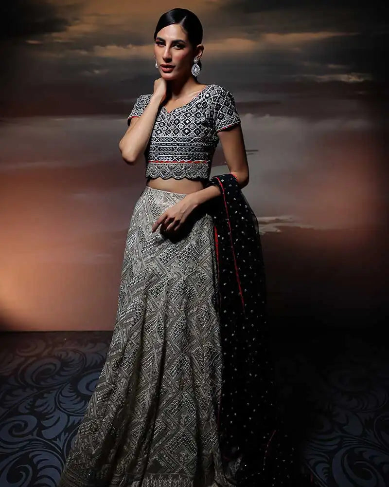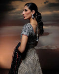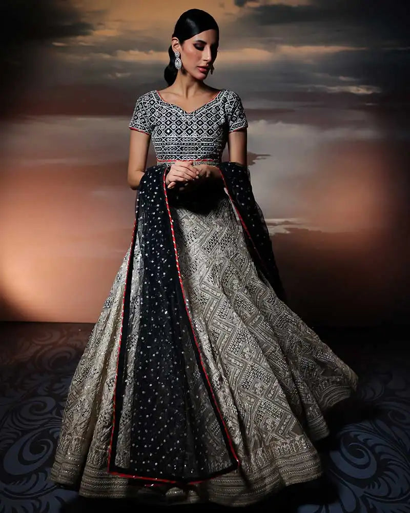 Black silk choli with seehsa and silk thread embroidery. Sleek cut skirt lame' tissue gharara fully cladded with seesha & zari embroidery. Black net duppata with chunn to compliment the look.