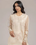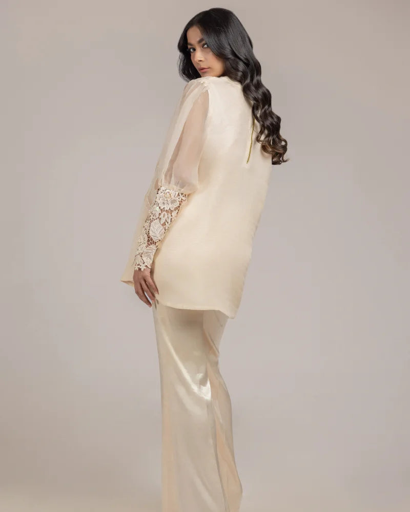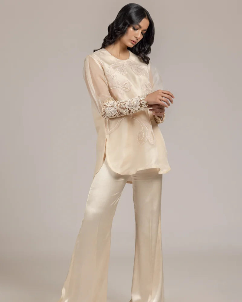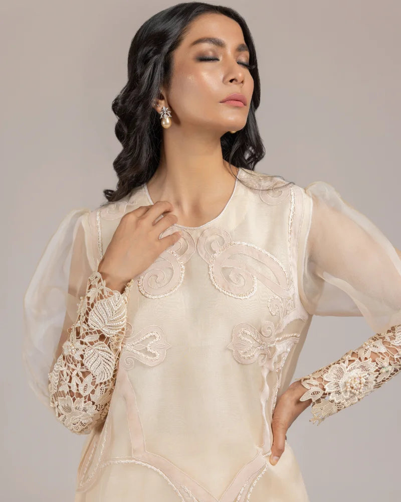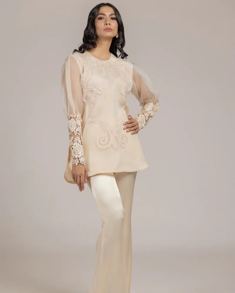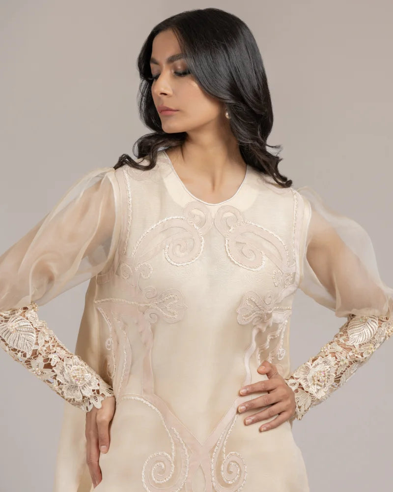 Detailing: Embroidered front with a handwork embelished cutwork cuff .