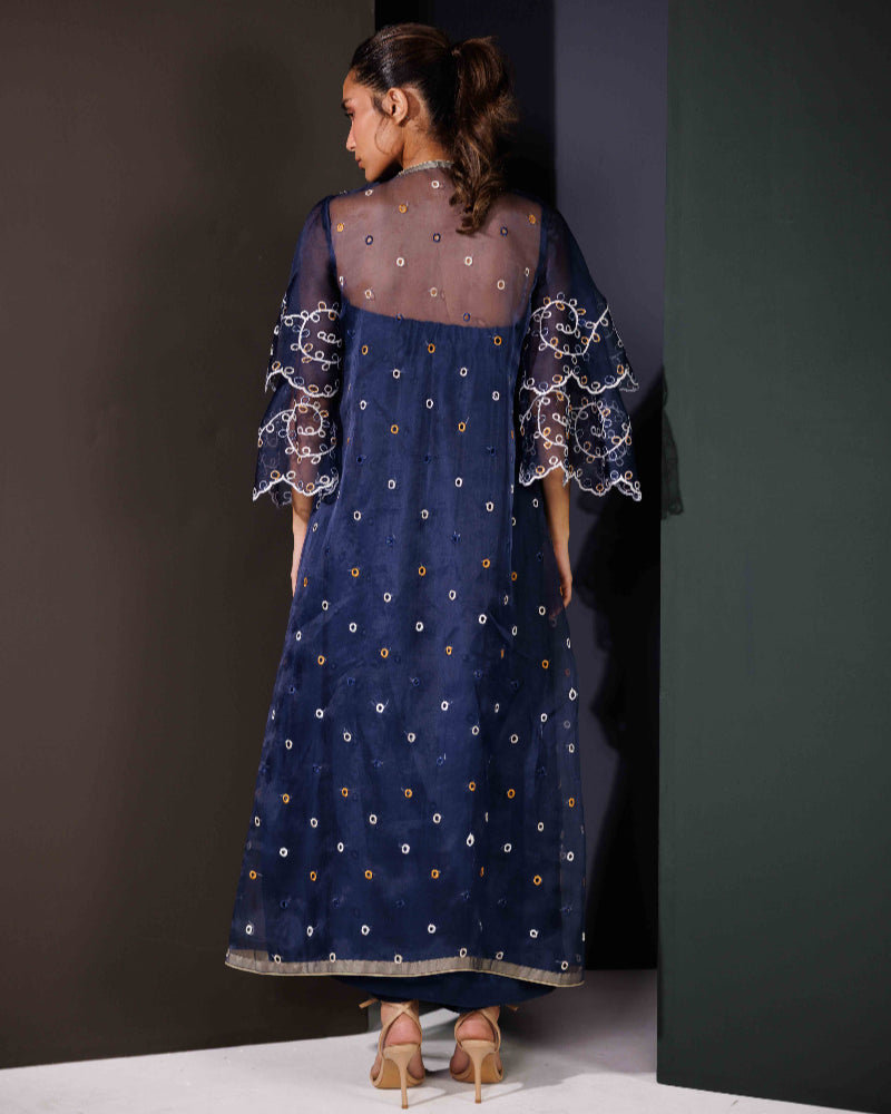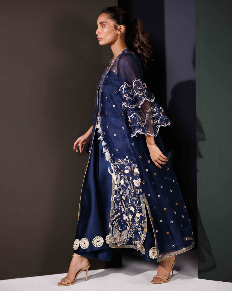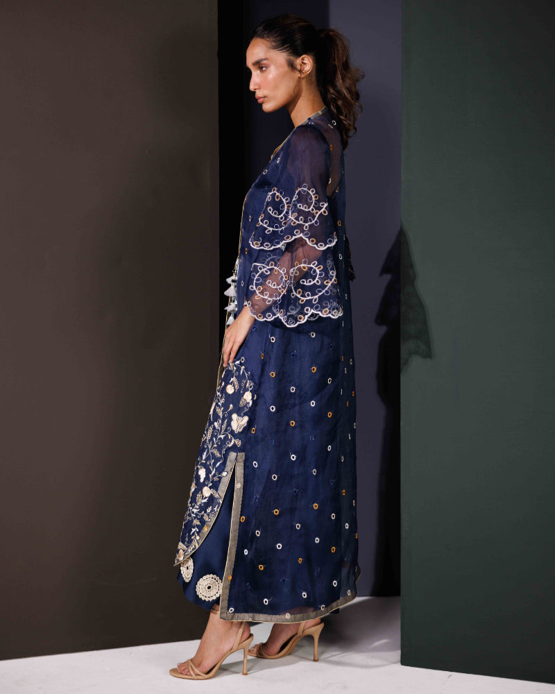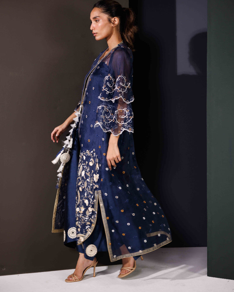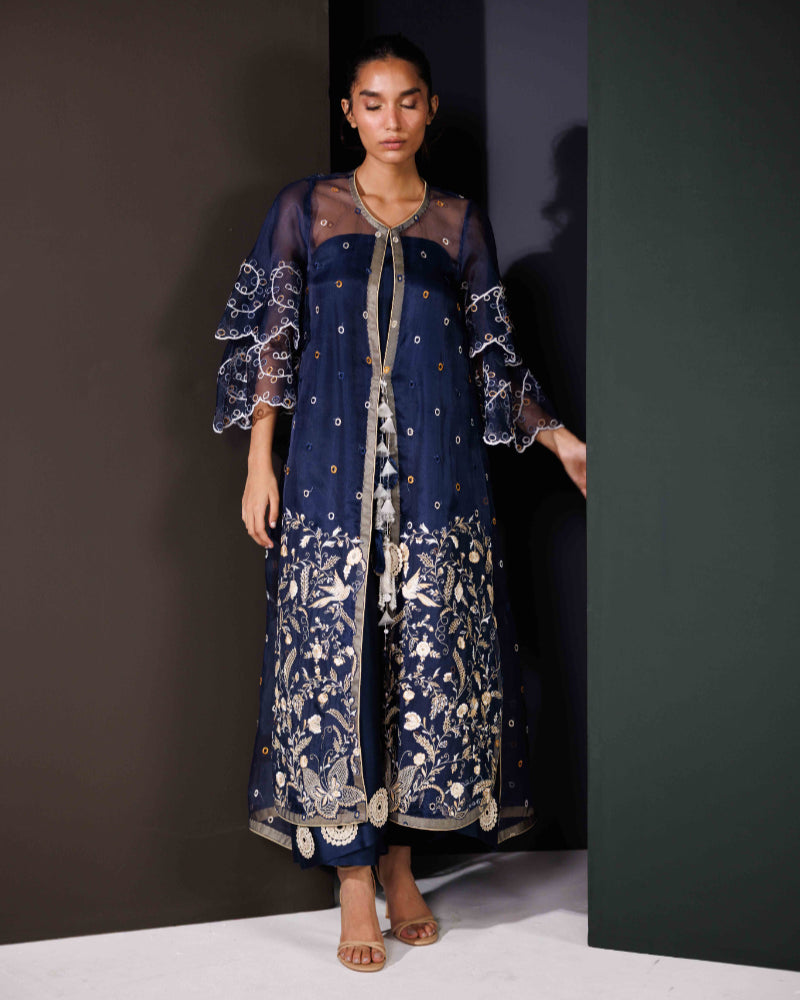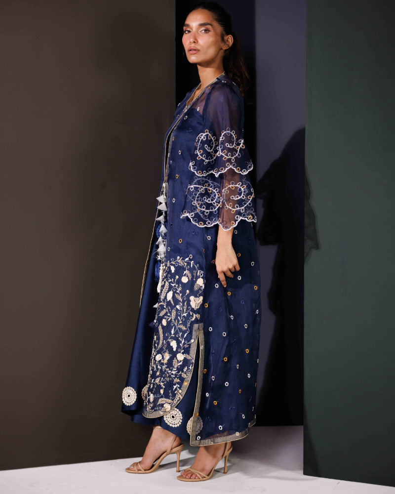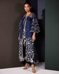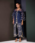 Elevate your occasion wear with the timeless elegance of the Zohra Navy Blue ensemble. This exquisite 3-piece set features a richly embroidered organza jacket paired with tailored pants and a coordinated inner slip, blending classic sophistication with modern design.