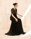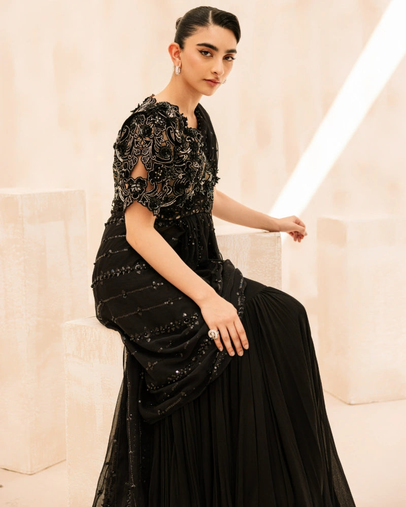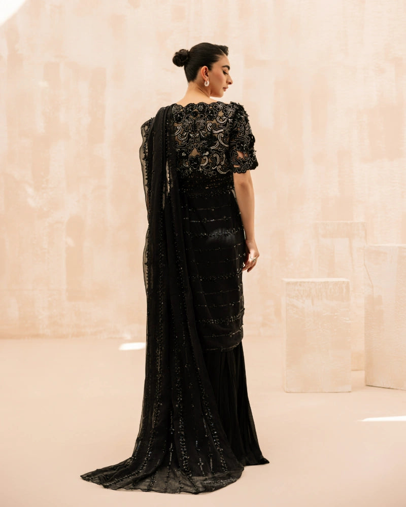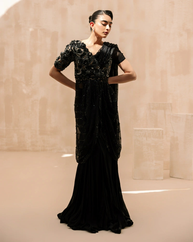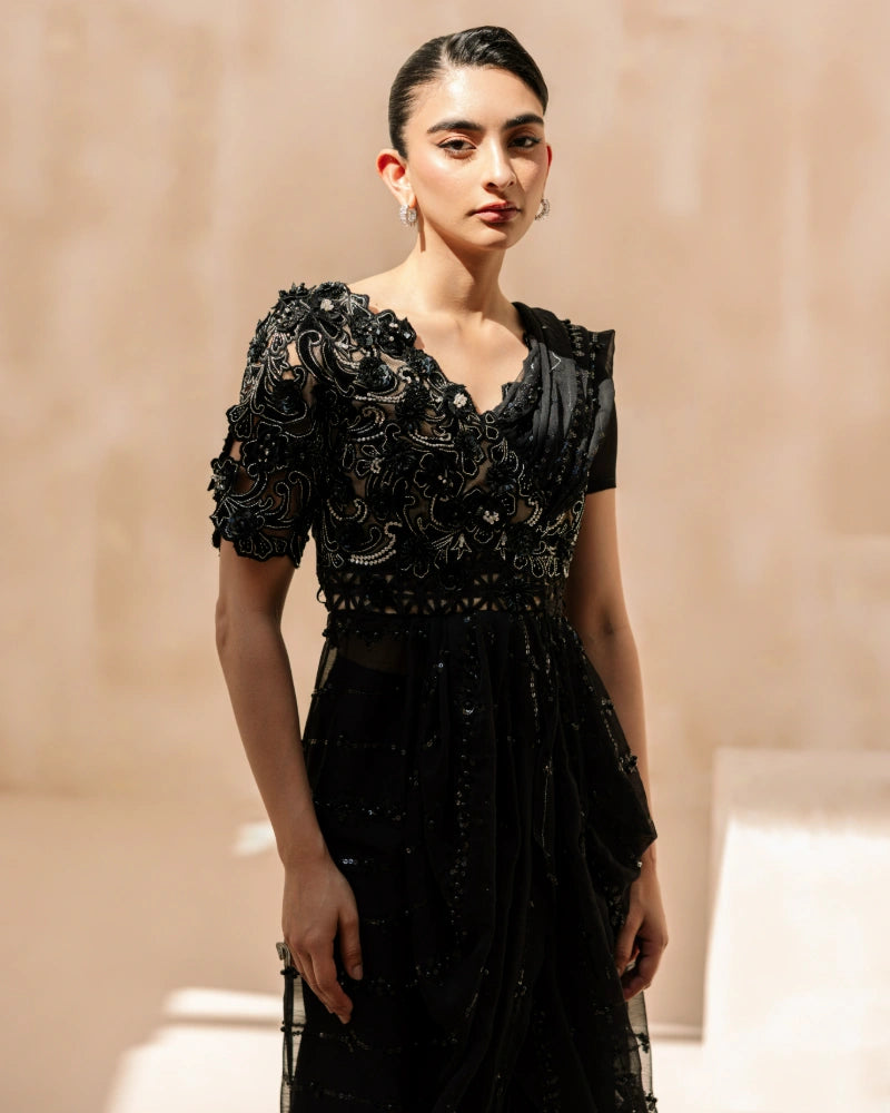 Detailing: A bold expression of glamour, Zoya Noir features a striking lehenga saree with an attached drape and a fully handworked blouse. The top is adorned with intricate 3D hand-cut florals and shimmering black crystals, making it a dramatic yet refined statement piece for evening elegance.